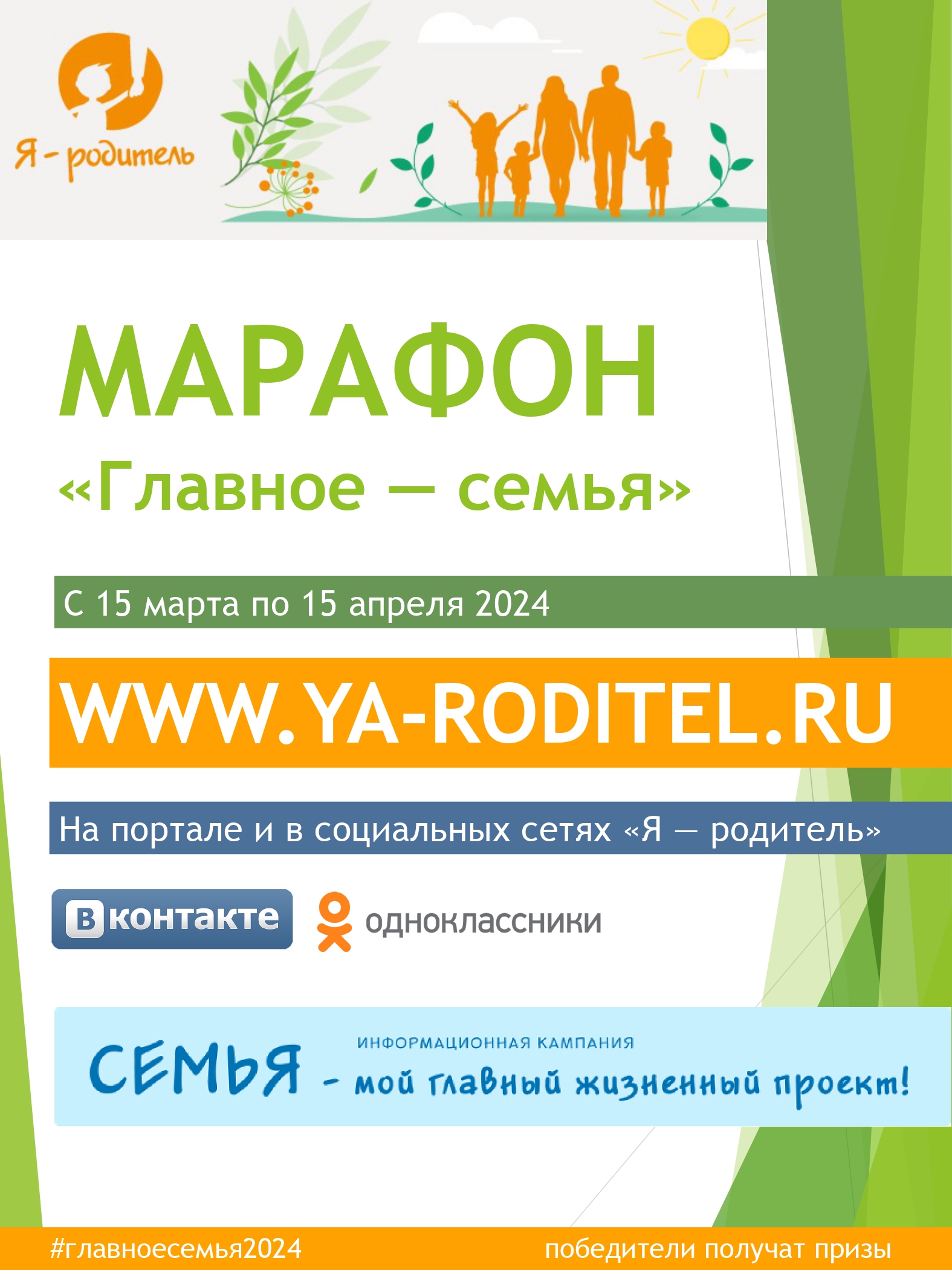 15 марта в социальных сетях портала «Я – родитель» стартует марафон под хештегом #главноесемья2024. К участию в марафоне приглашаются родители и дети. Им предлагается вспомнить любимые цитаты о семье из фильмов, песен, стихов, книг и поделиться ими на своей странице в социальных сетях Вконтакте и Одноклассники.